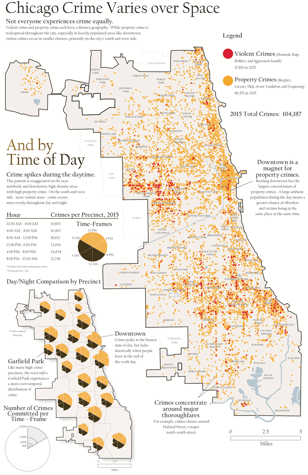 This was my final project for Geography 370, an introductory cartography course at UW Madison. Having just moved to Madison from Chicago, I was curious about the spatial and temporal patterns of crime in Chicago. Does violent crime and property crime share a similar geographic pattern? And during what time of day do these crimes occur?